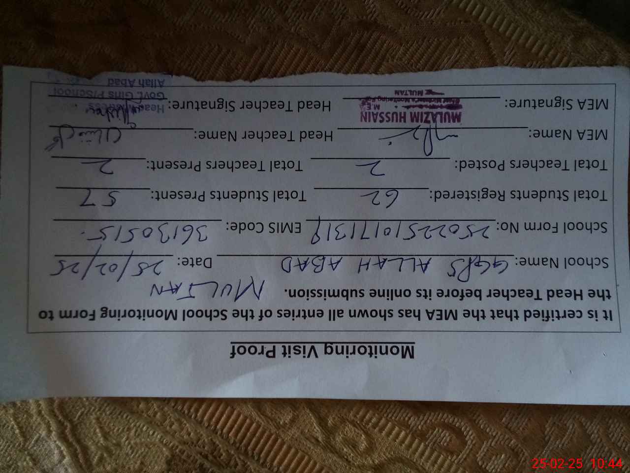 | Certified that this School was Inspected by the Undersigned MEA/DMO Today and the Information Stated Above is as Per Record. | |||||