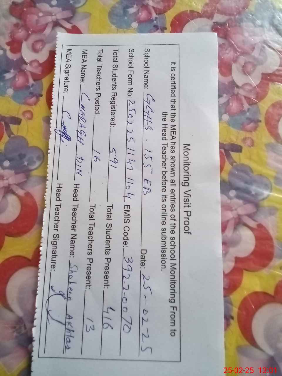 | Attendance Register | Head Teacher | MEA with School | Visit Proof |