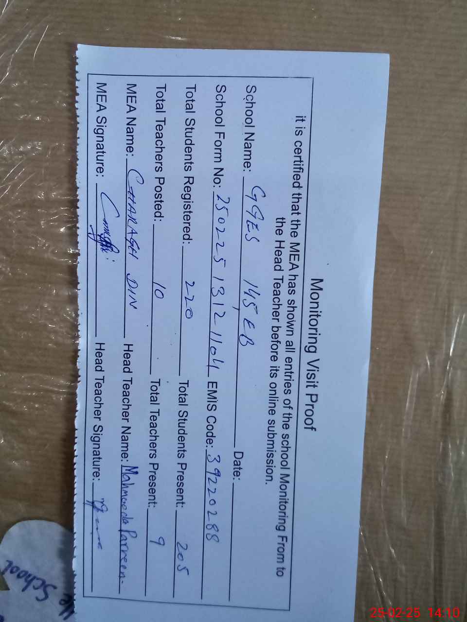 | Attendance Register | Head Teacher | MEA with School | Visit Proof |