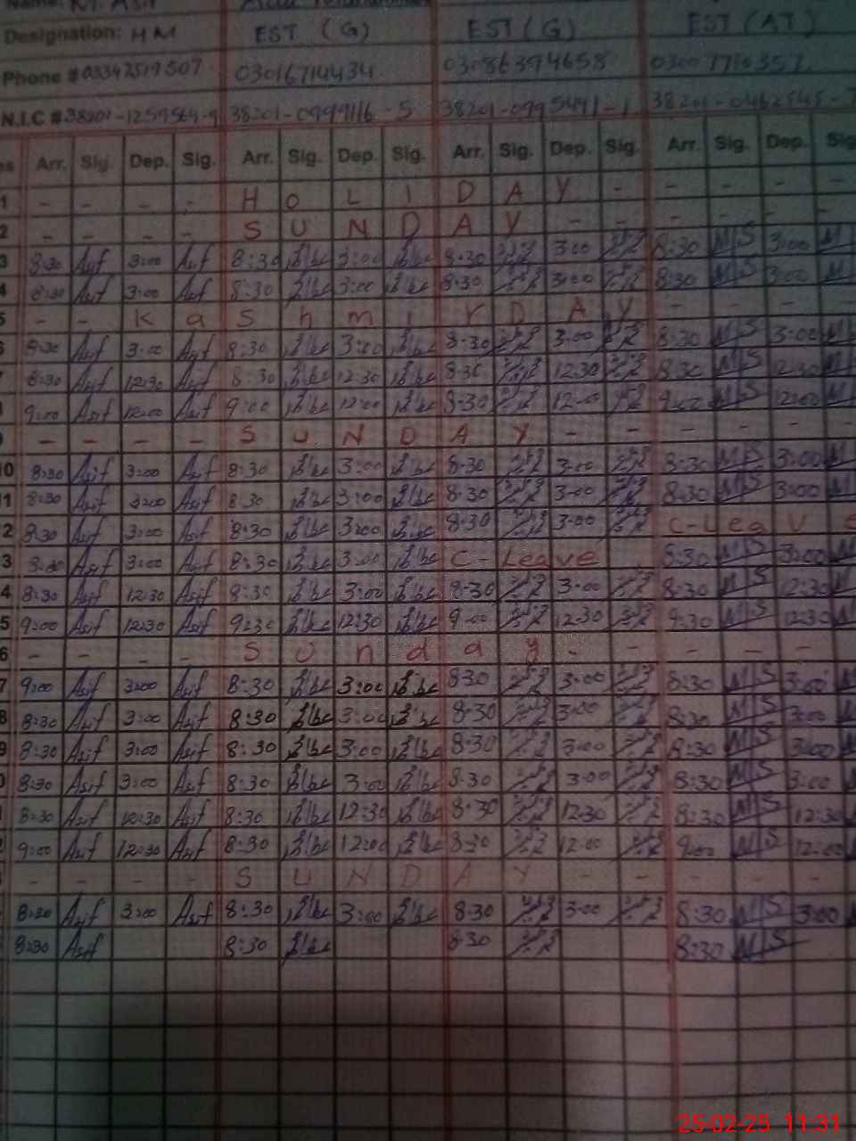 | CNIC | Full Name | Designation | R/C | Absence during last cal. month |
