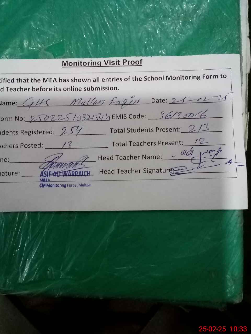 | EMIS Code: 36130016 | Name of School: GHS MULLAN FAQIR BUDHLA MULTAN | |||