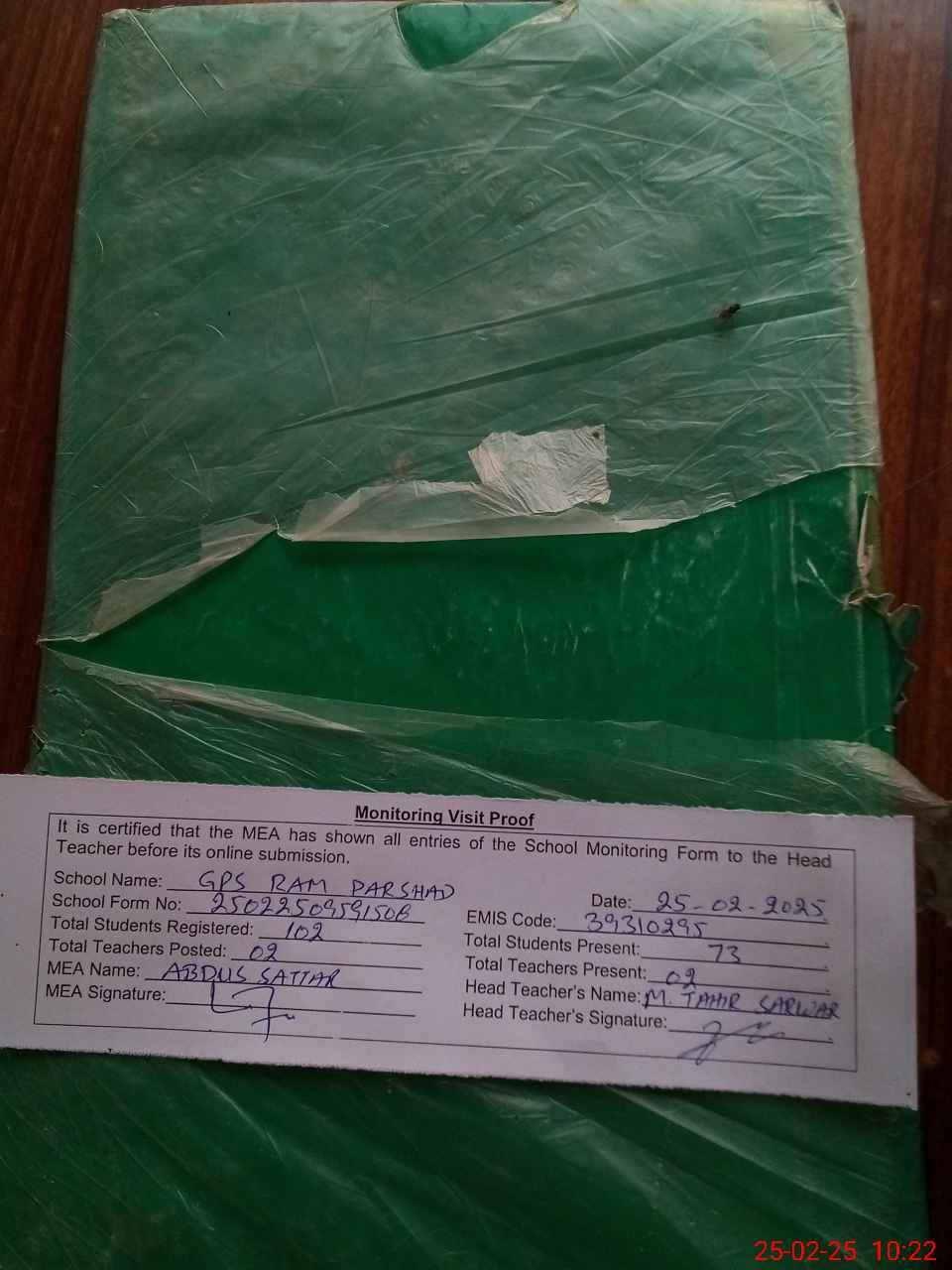 | Attendance Register | Head Teacher | MEA with School | Visit Proof |