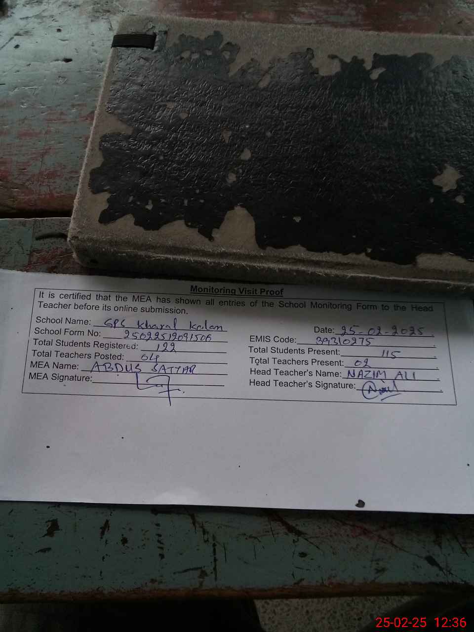 | Attendance Register | Head Teacher | MEA with School | Visit Proof |