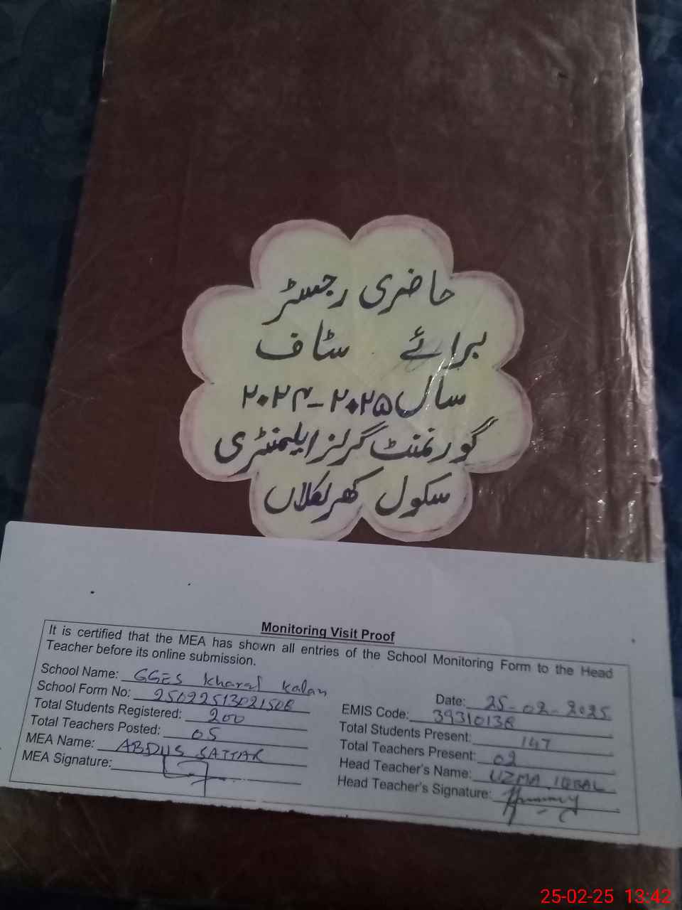 | Attendance Register | Head Teacher | MEA with School | Visit Proof |