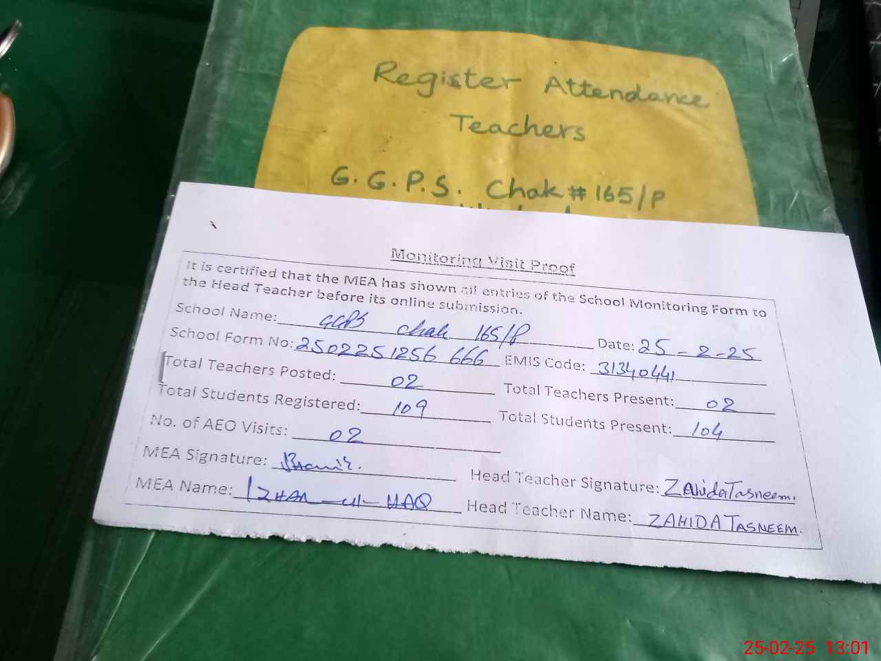 | Attendance Register | Head Teacher | MEA with School | Visit Proof |