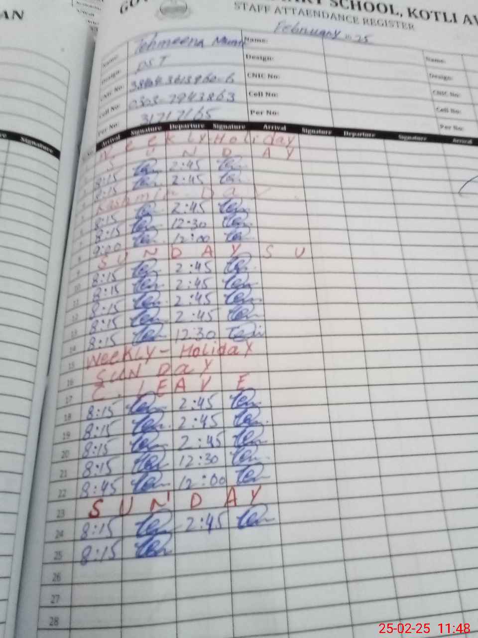 | CNIC | Full Name | Designation | R/C | Absence During Last Calender Month |