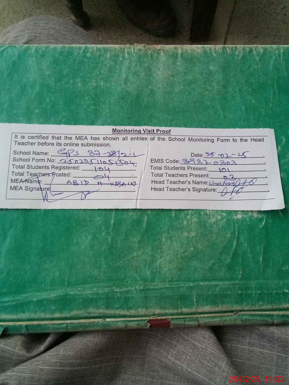 | Attendance Register | Head Teacher | MEA with School | Visit Proof |