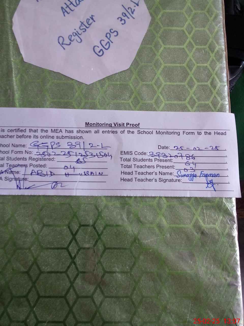 | Attendance Register | Head Teacher | MEA with School | Visit Proof |