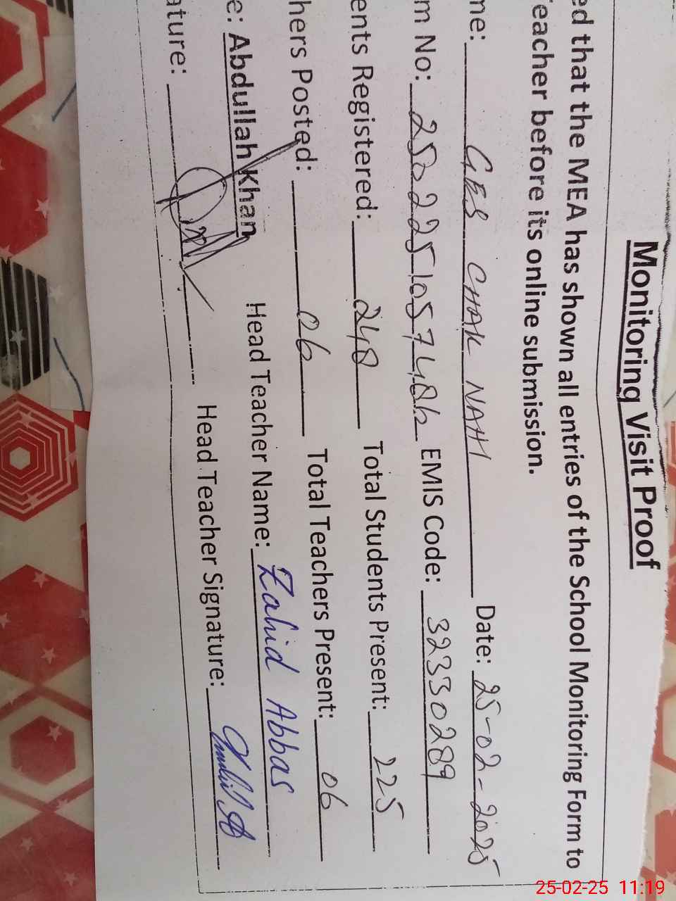 | EMIS Code: 32330289 | Name of School: GES CHAK NAHI | |||