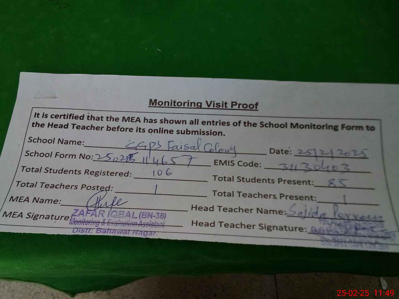 | EMIS Code: 31130403 | Name of School: GGPS FAISAL COLONY | |||