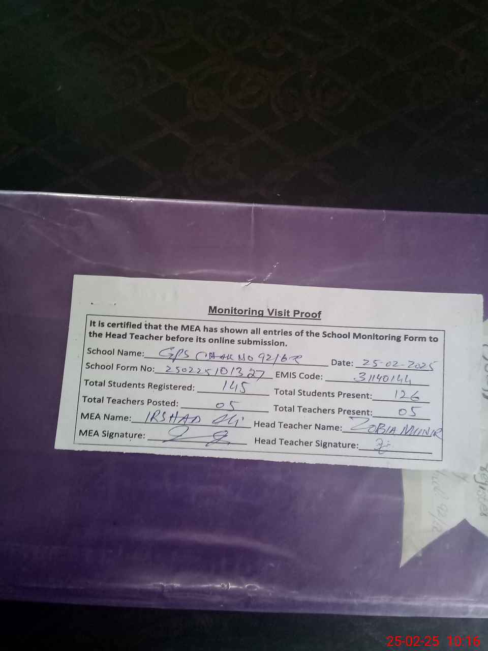 | Attendance Register | Head Teacher | MEA with School | Visit Proof |
