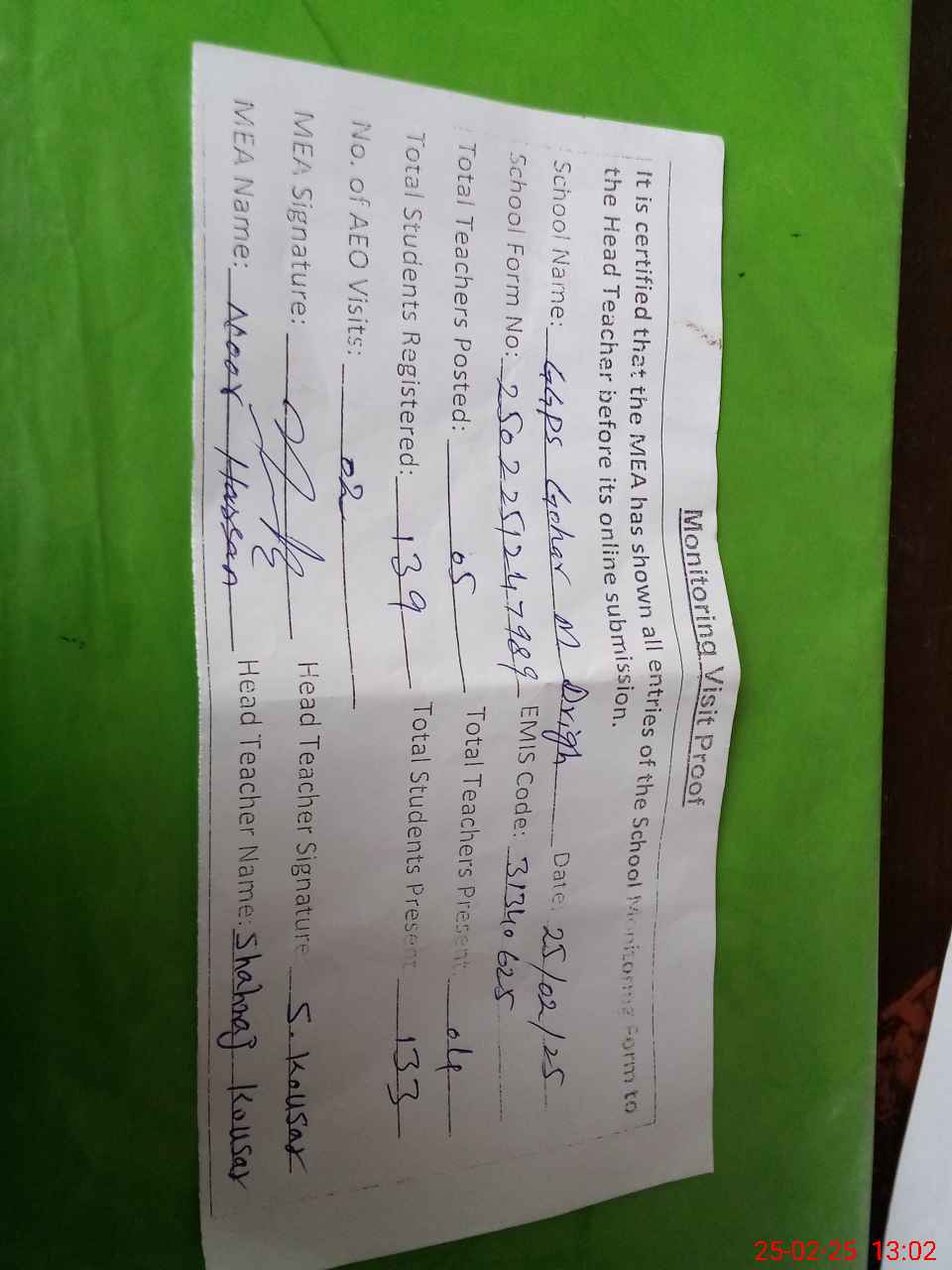 | Attendance Register | Head Teacher | MEA with School | Visit Proof |
