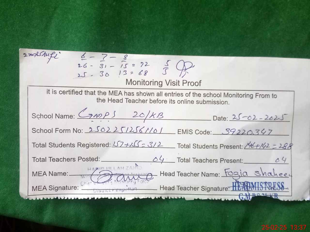 | Attendance Register | Head Teacher | MEA with School | Visit Proof |