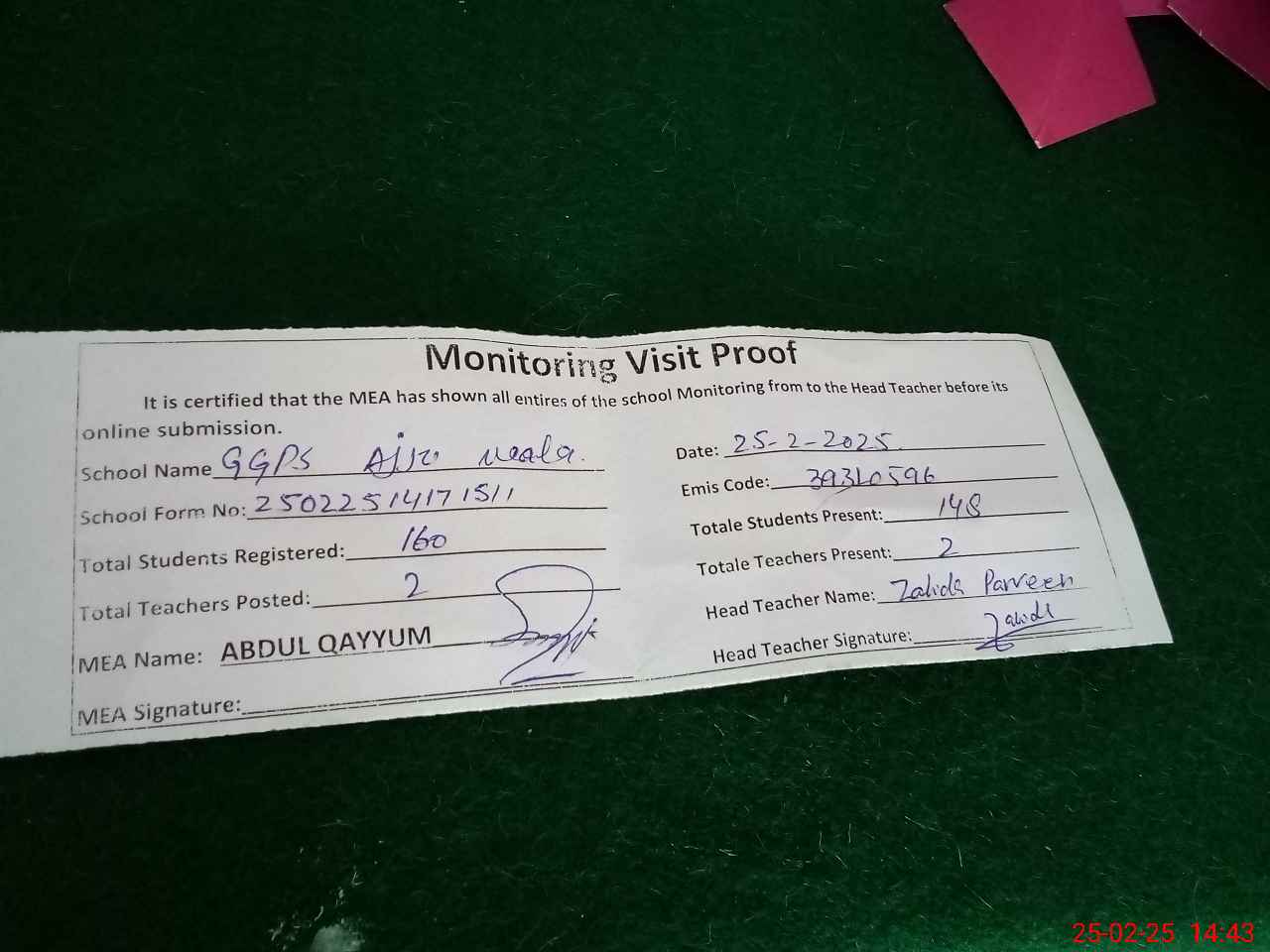 | Attendance Register | Head Teacher | MEA with School | Visit Proof |