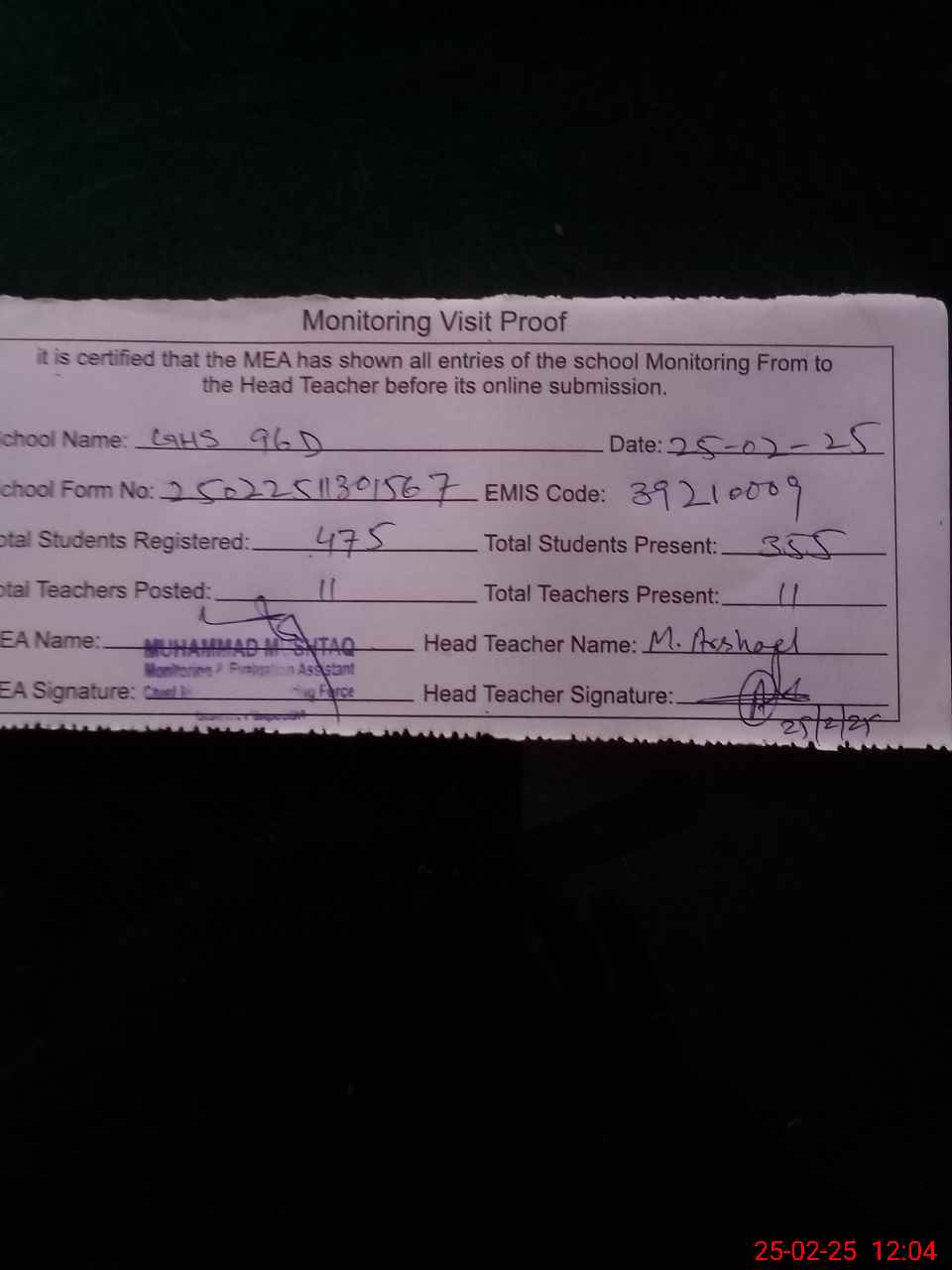 | Attendance Register | Head Teacher | MEA with School | Visit Proof |