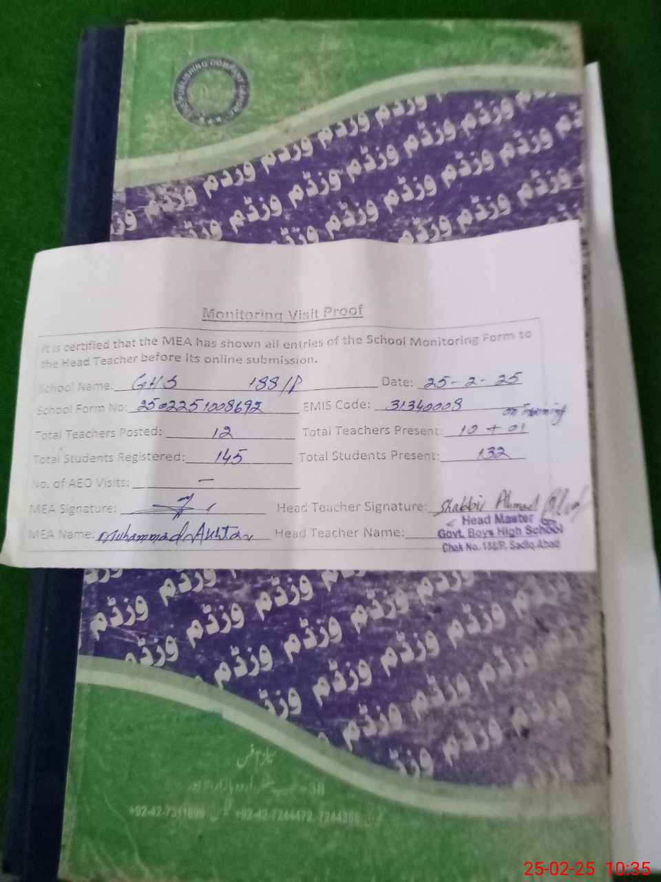 | EMIS Code: 31340008 | Name of School: GHS CHAK NO. 188/P | |||