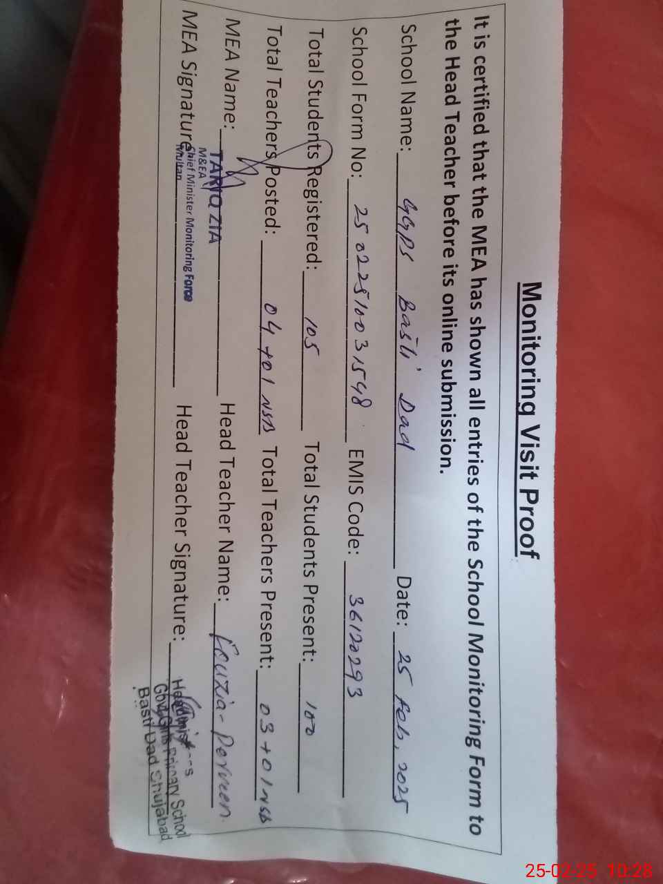 | EMIS Code: 36120293 | Name of School: GGPS BASTI DAD SHUJABAD MULTAN | |||