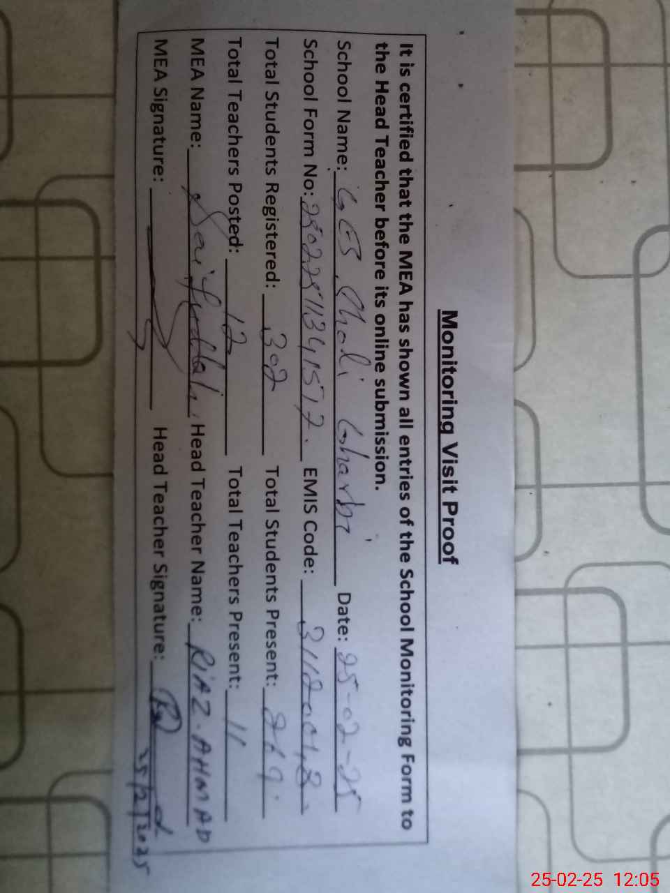 | Attendance Register | Head Teacher | MEA with School | Visit Proof |