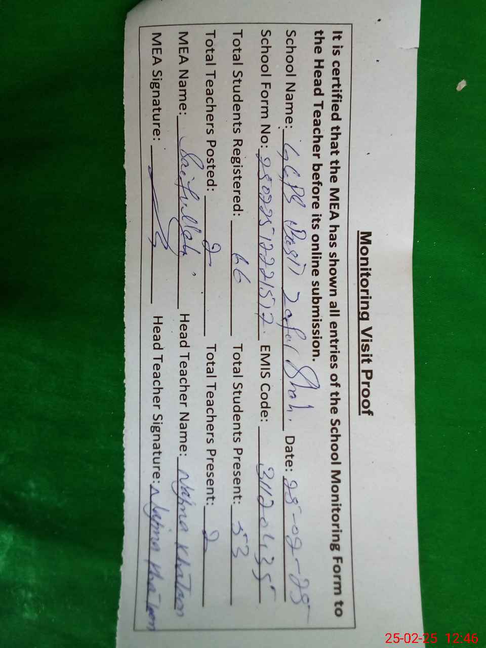 | Attendance Register | Head Teacher | MEA with School | Visit Proof |
