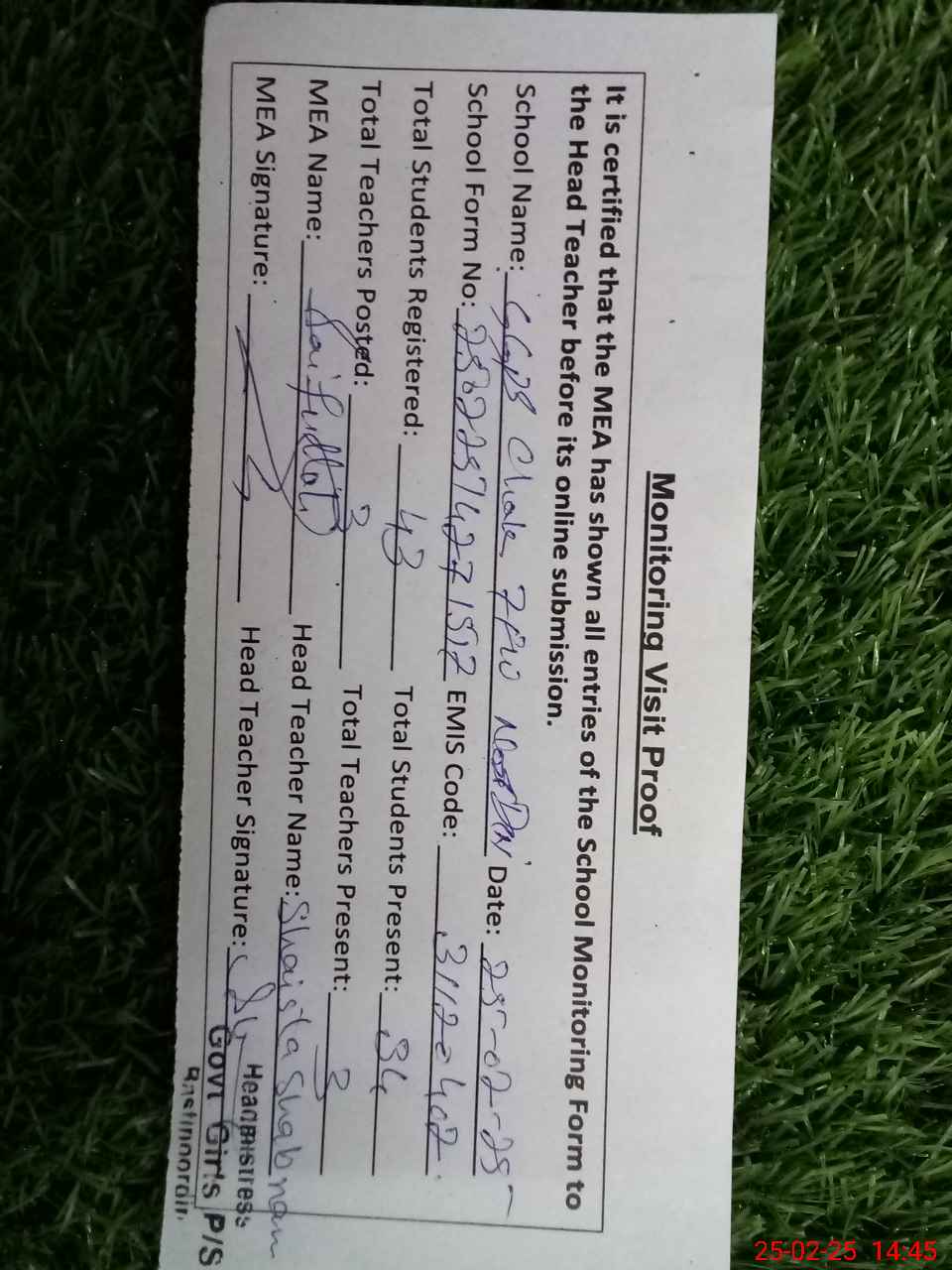 | Attendance Register | Head Teacher | MEA with School | Visit Proof |
