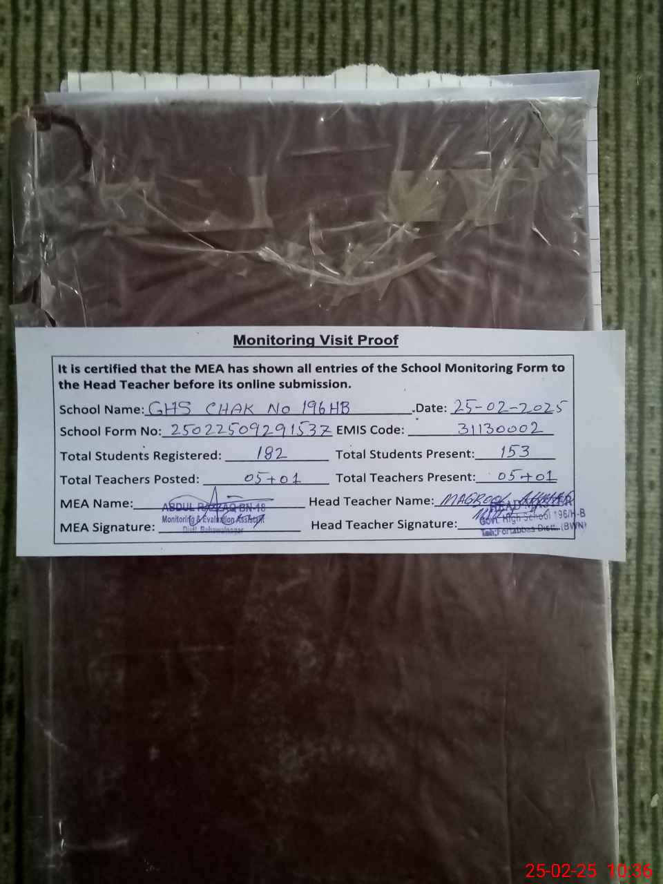 | Attendance Register | Head Teacher | MEA with School | Visit Proof |