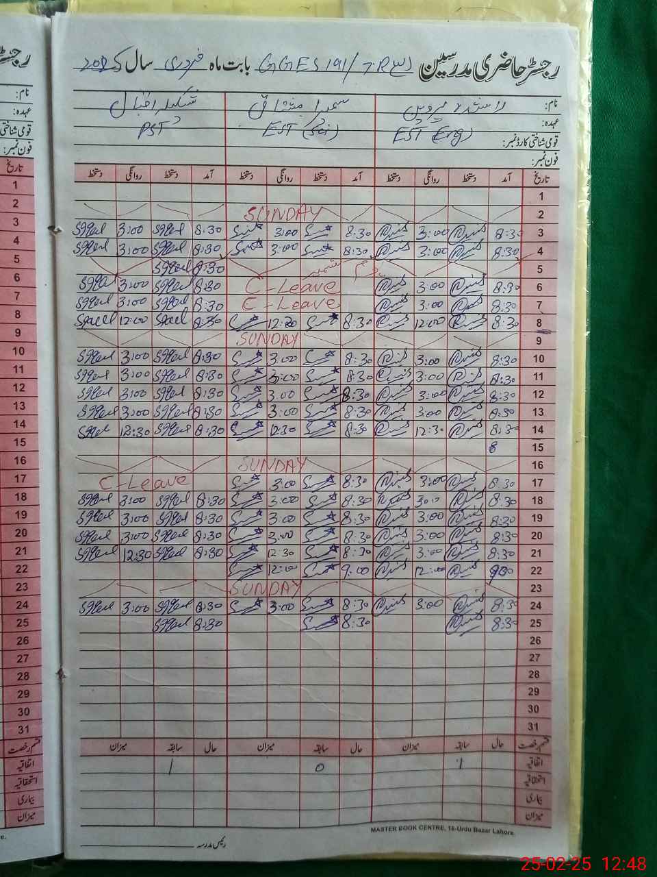 | CNIC | Full Name | Designation | R/C | Absence During Last Calender Month |