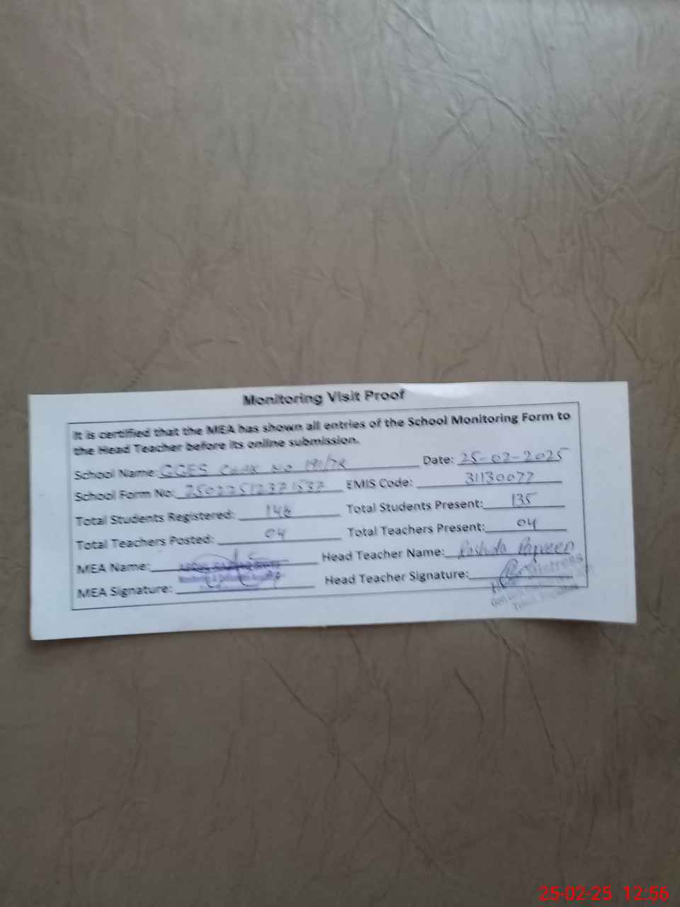 | Attendance Register | Head Teacher | MEA with School | Visit Proof |