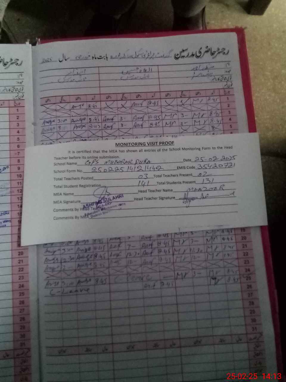 | Attendance Register | Head Teacher | MEA with School | Visit Proof |