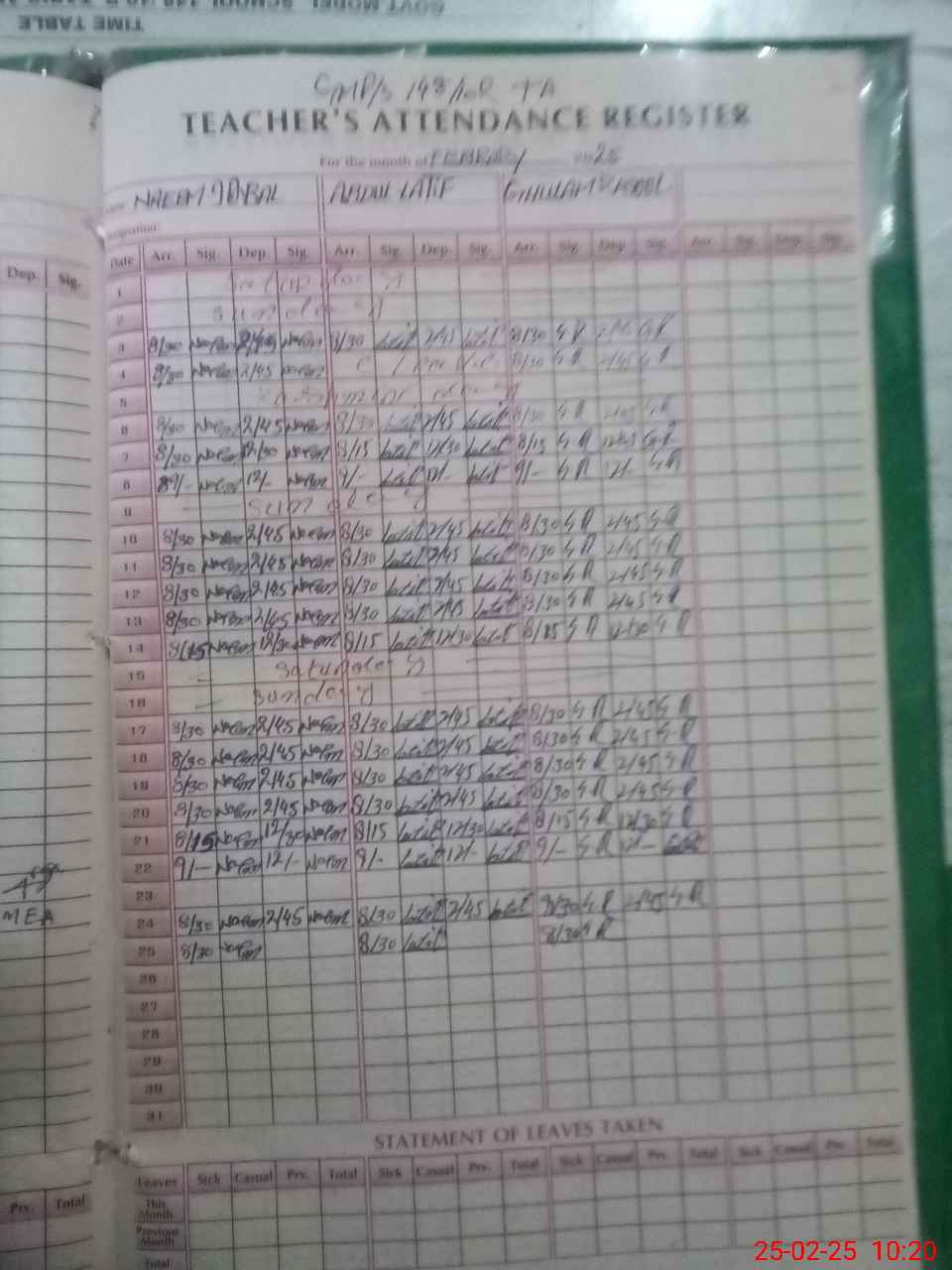 | Leave | Duty | Absent | Maternity | Medical | Ex- Pak |