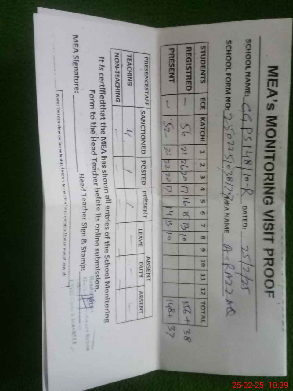 | Attendance Register | Head Teacher | MEA with School | Visit Proof |