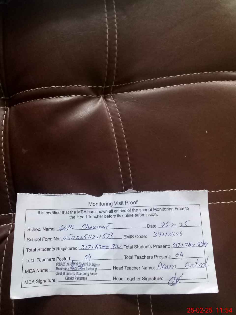 | District: PAKPATTAN | Tehsil: PAKPATTAN | Markaz: PAKPATTAN 1 - FEMALE | Level: Primary | |