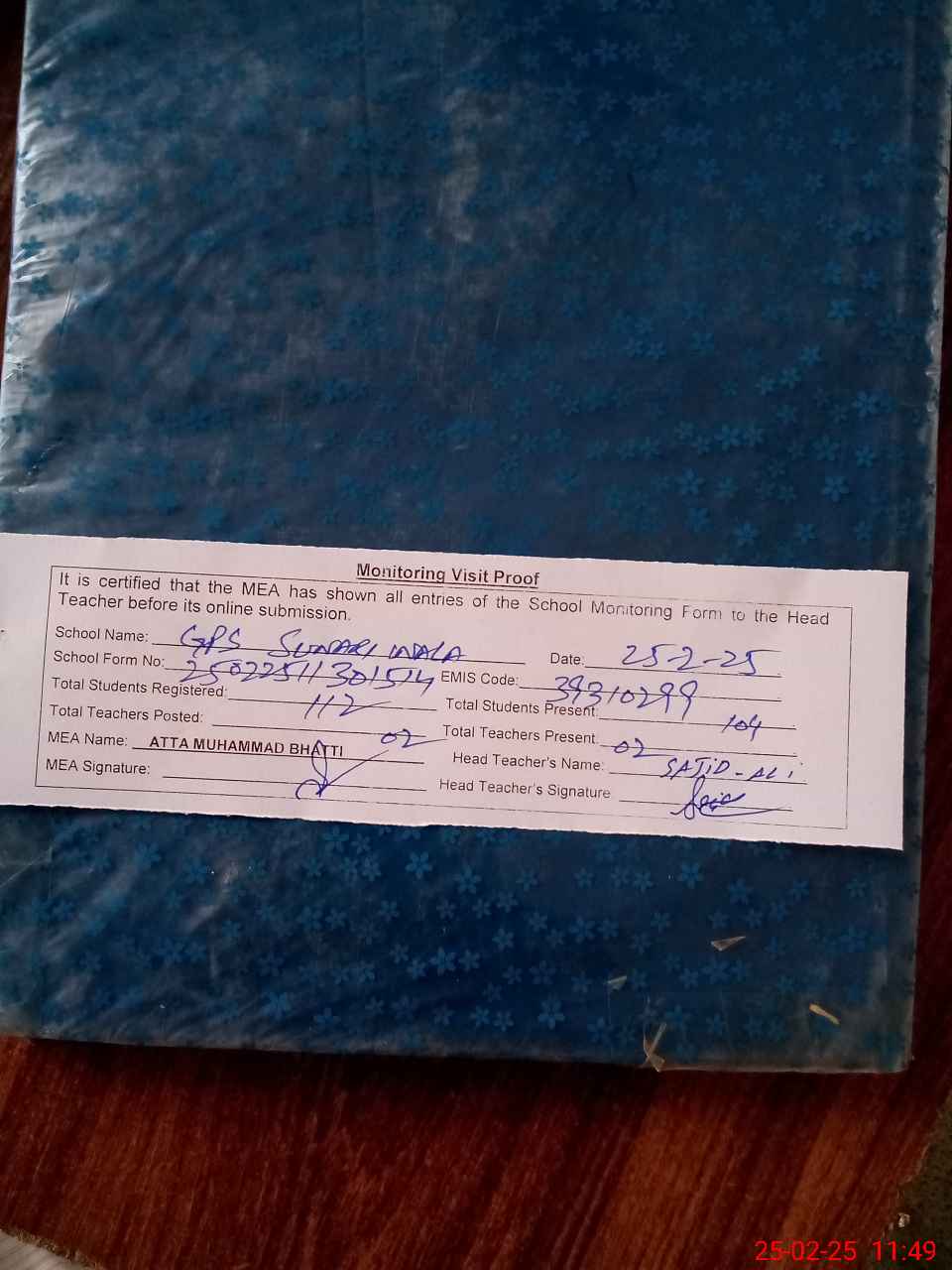 | Attendance Register | Head Teacher | MEA with School | Visit Proof |