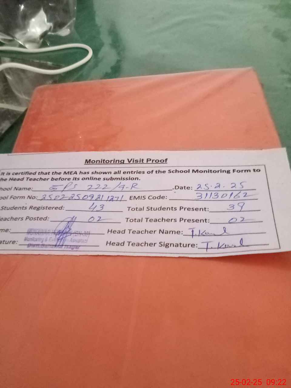 | Attendance Register | Head Teacher | MEA with School | Visit Proof |