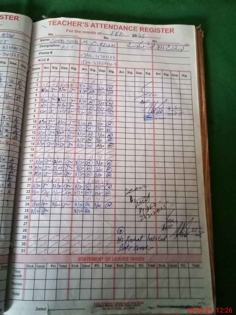 | Name: AB**** GH**** Designation: (School Headmaster's/Headmistress's) PST Phone/Cell Number: 03**** |