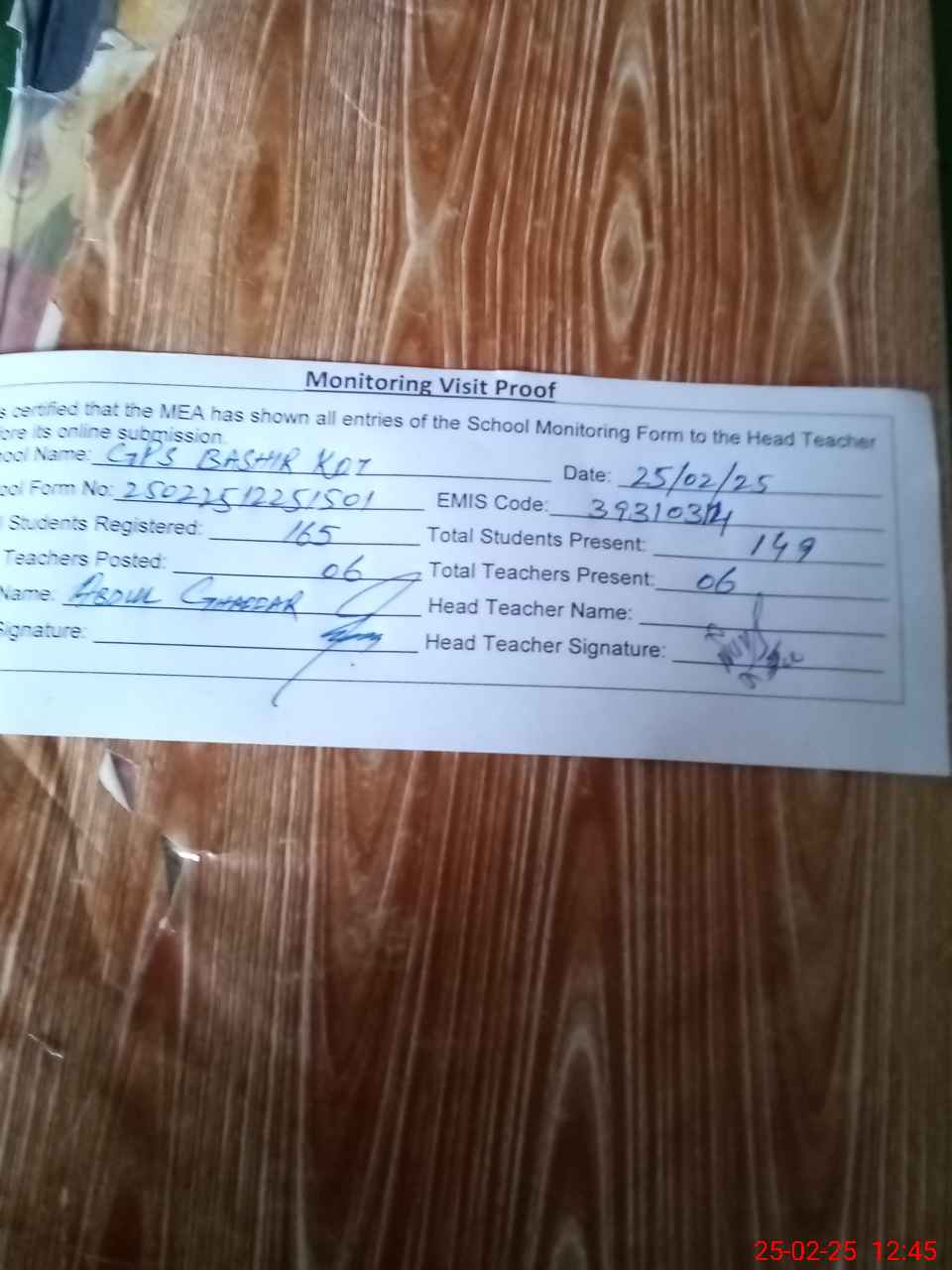 | Attendance Register | Head Teacher | MEA with School | Visit Proof |