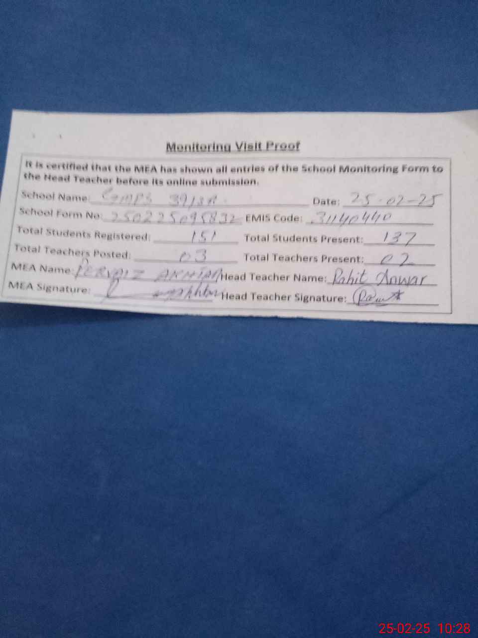 | Attendance Register | Head Teacher | MEA with School | Visit Proof |