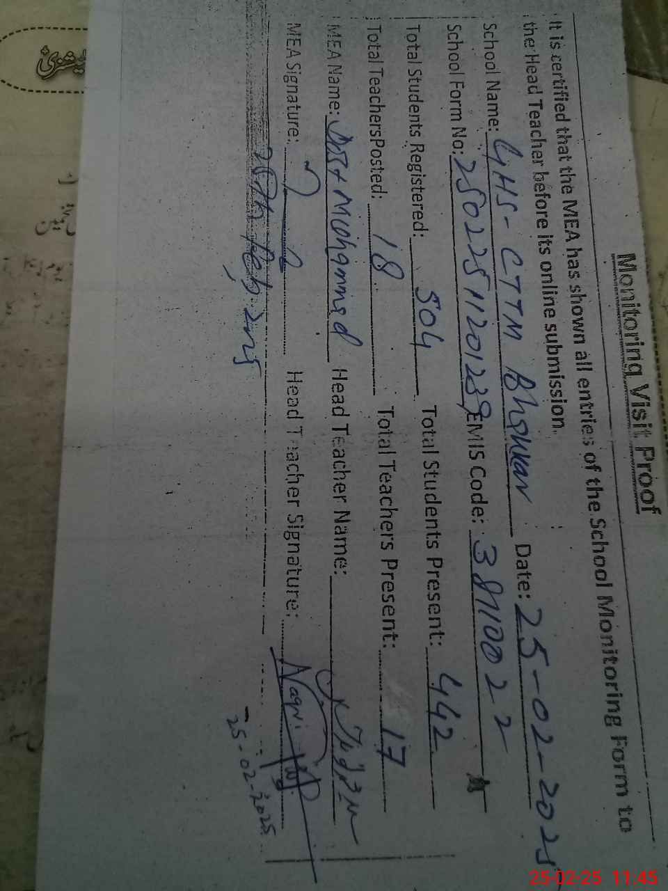 | Attendance Register | Head Teacher | MEA with School | Visit Proof |