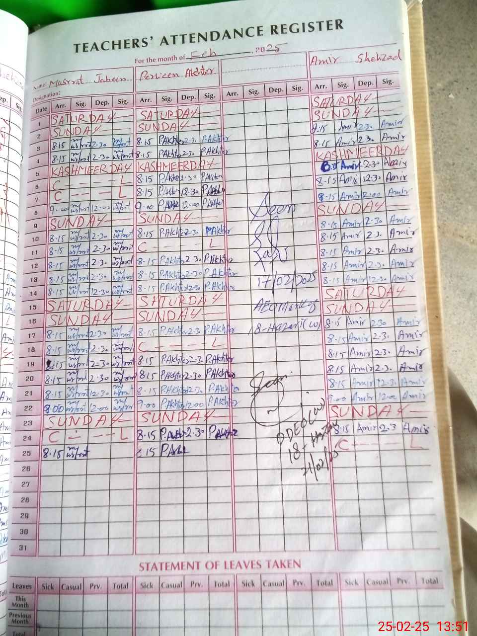 | CNIC | Full Name | Designation | R/C | Absence During Last Calender Month |