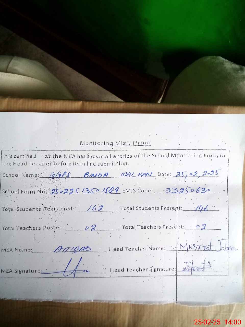 | Attendance Register | Head Teacher | MEA with School | Visit Proof |