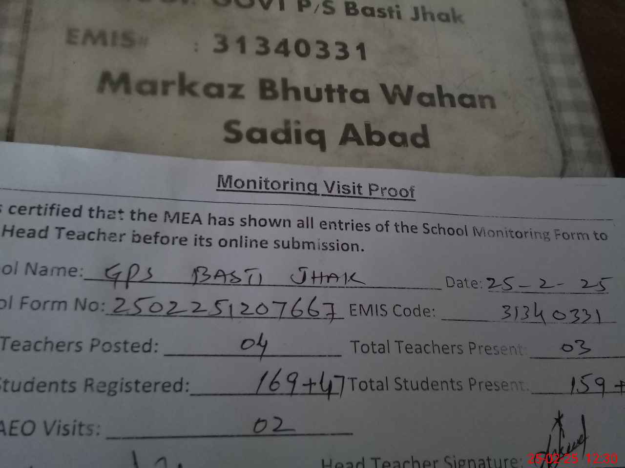 | District: RAHIMYAR KHAN | Tehsil: SADIQABAD | Markaz: BHUTTA WAHAN - MALE | Level: Primary | |