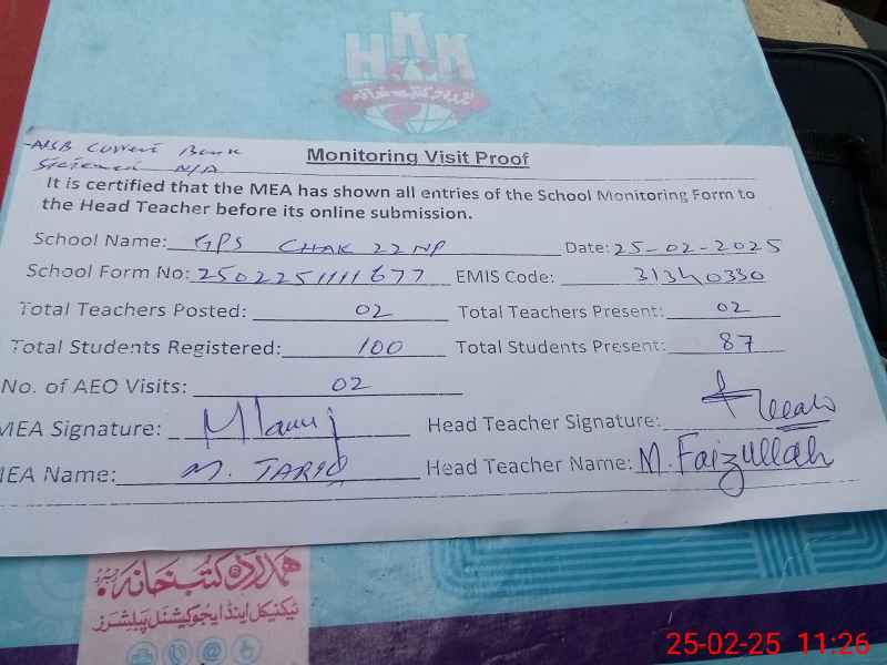 | EMIS Code: 31340330 | Name of School: GPS CHAK NO 22/NP | |||