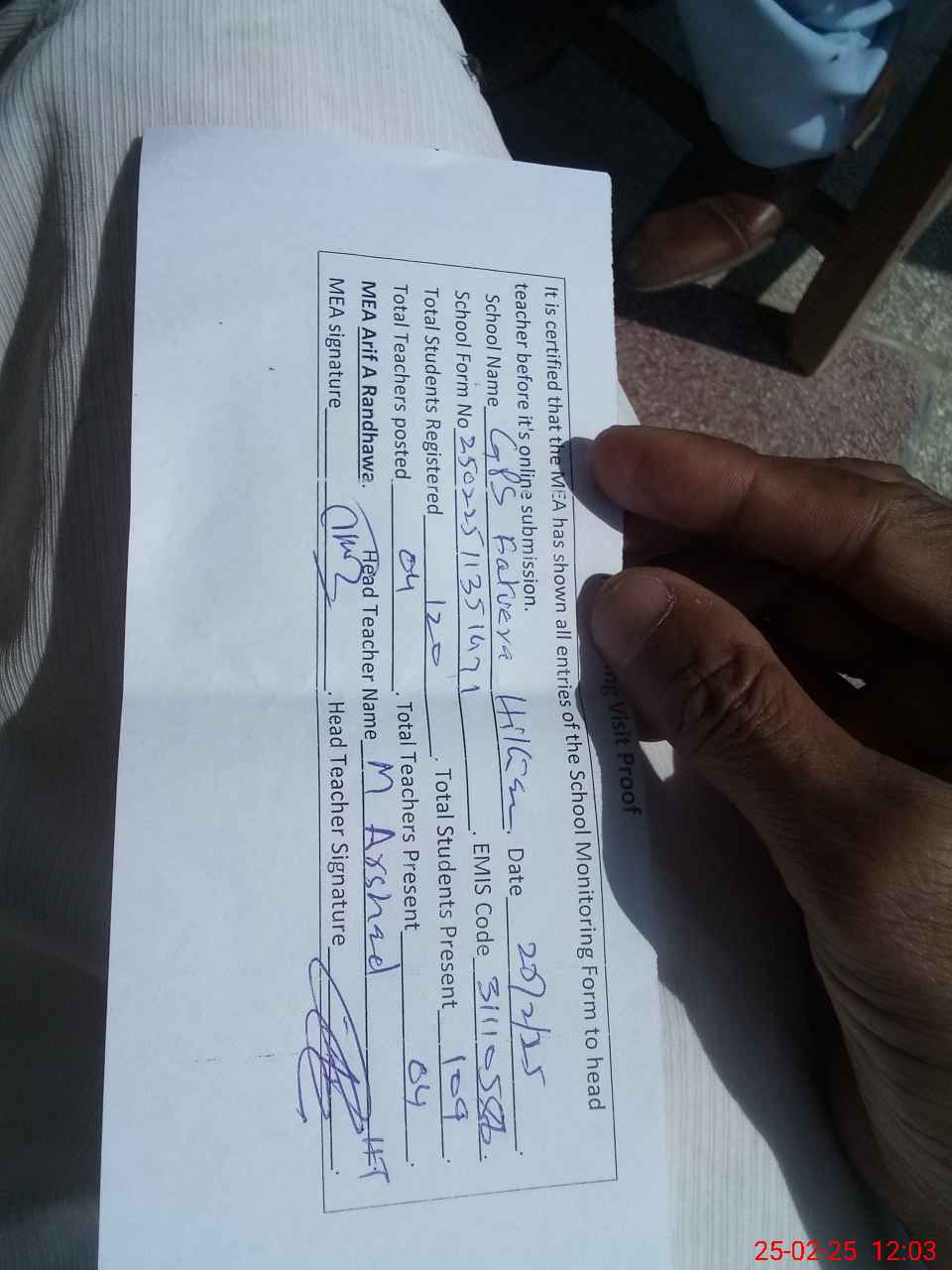 | Attendance Register | Head Teacher | MEA with School | Visit Proof |