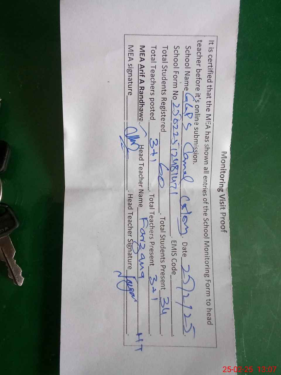 | Attendance Register | Head Teacher | MEA with School | Visit Proof |