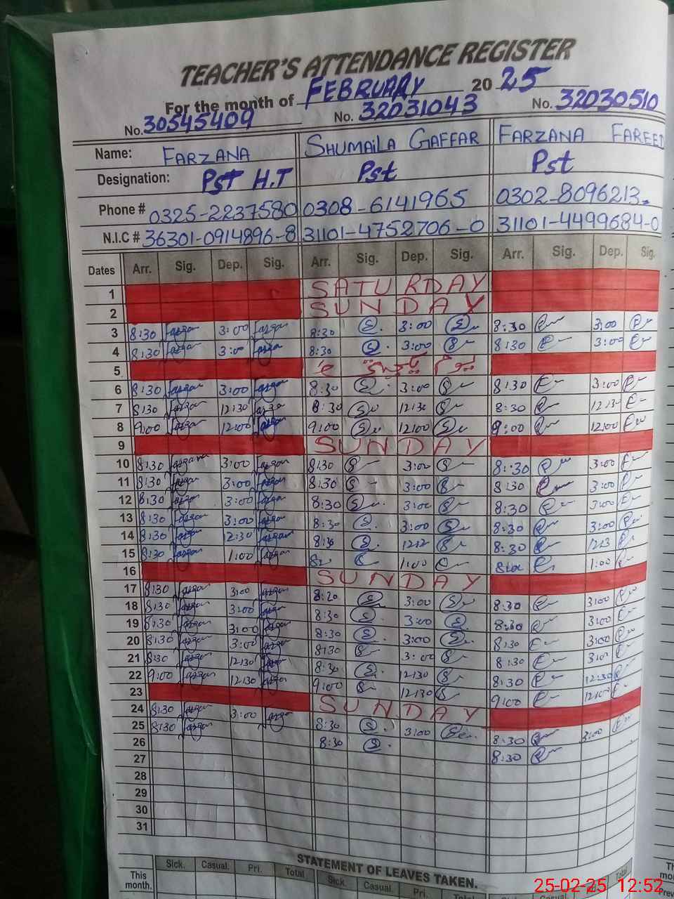 | CNIC | Full Name | Designation | R/C | Absence During Last Calender Month |