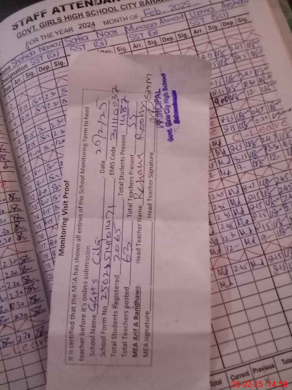 | Attendance Register | Head Teacher | MEA with School | Visit Proof |