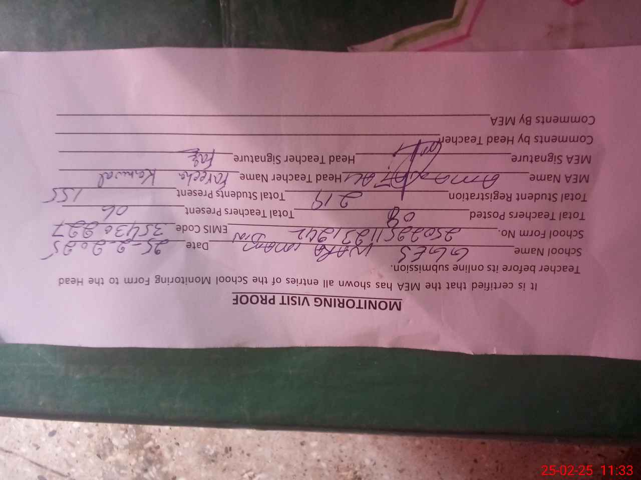 | Attendance Register | Head Teacher | MEA with School | Visit Proof |