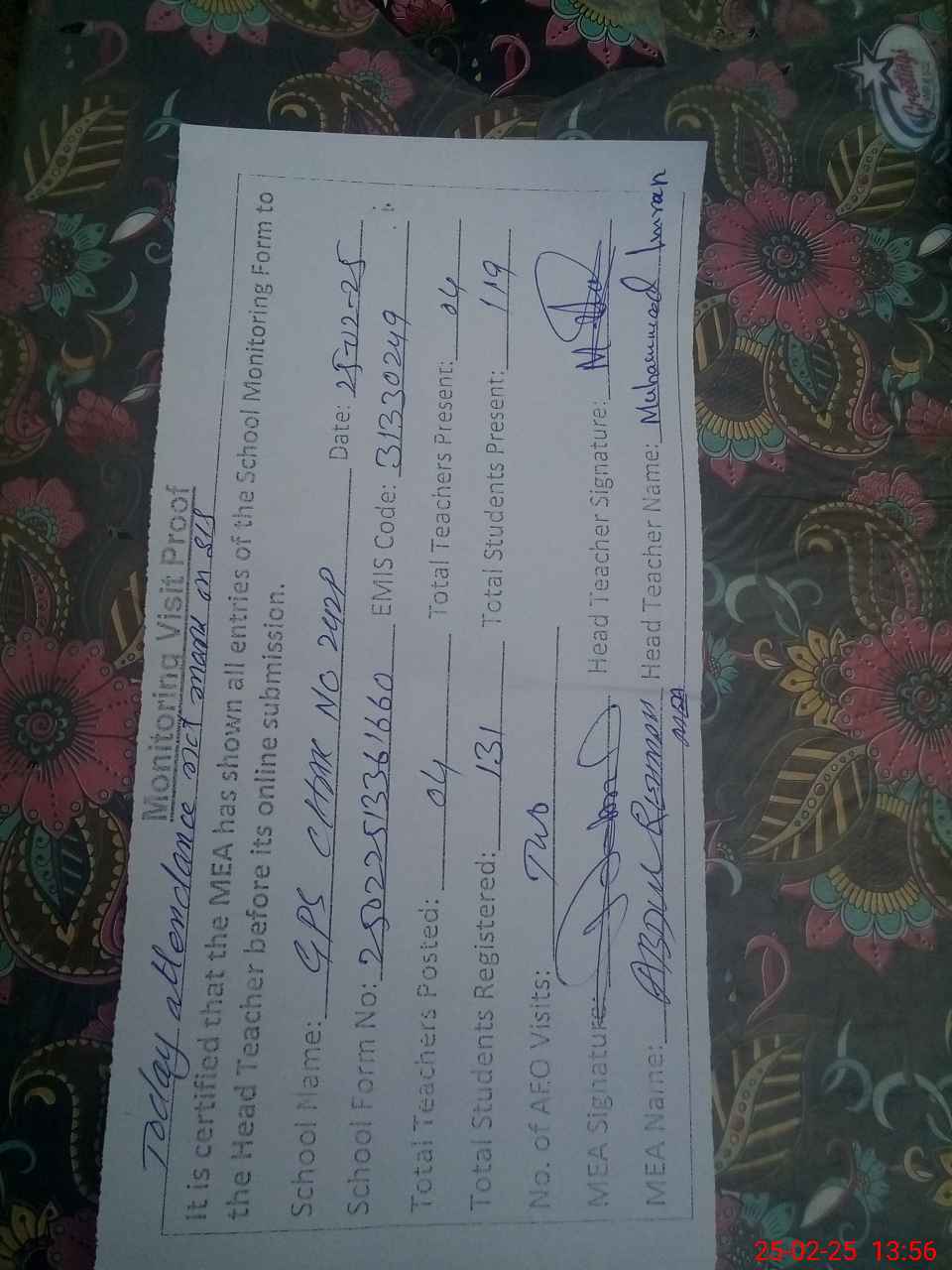 | Attendance Register | Head Teacher | MEA with School | Visit Proof |