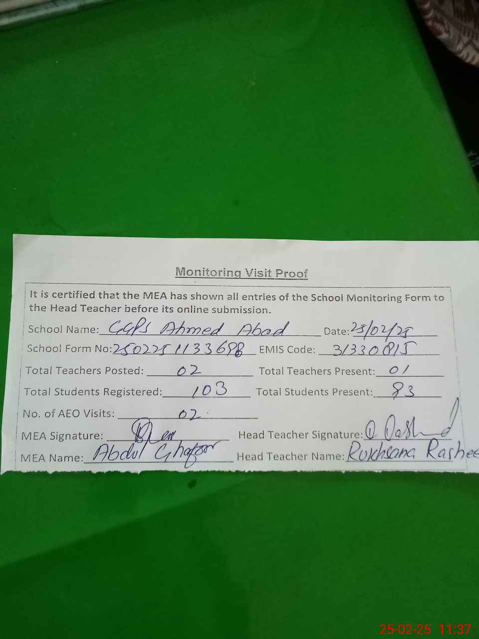 | Attendance Register | Head Teacher | MEA with School | Visit Proof |
