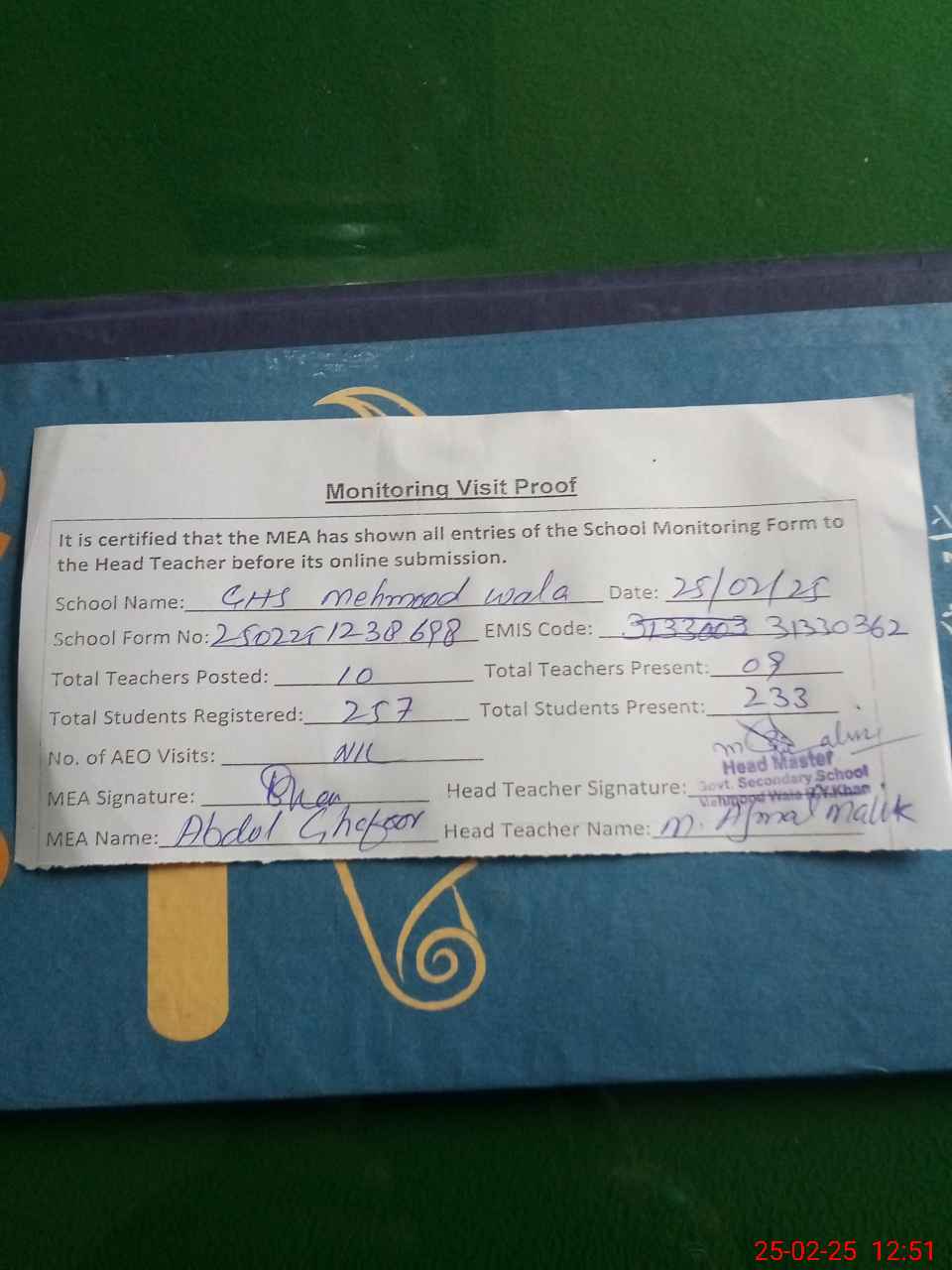 | Attendance Register | Head Teacher | MEA with School | Visit Proof |