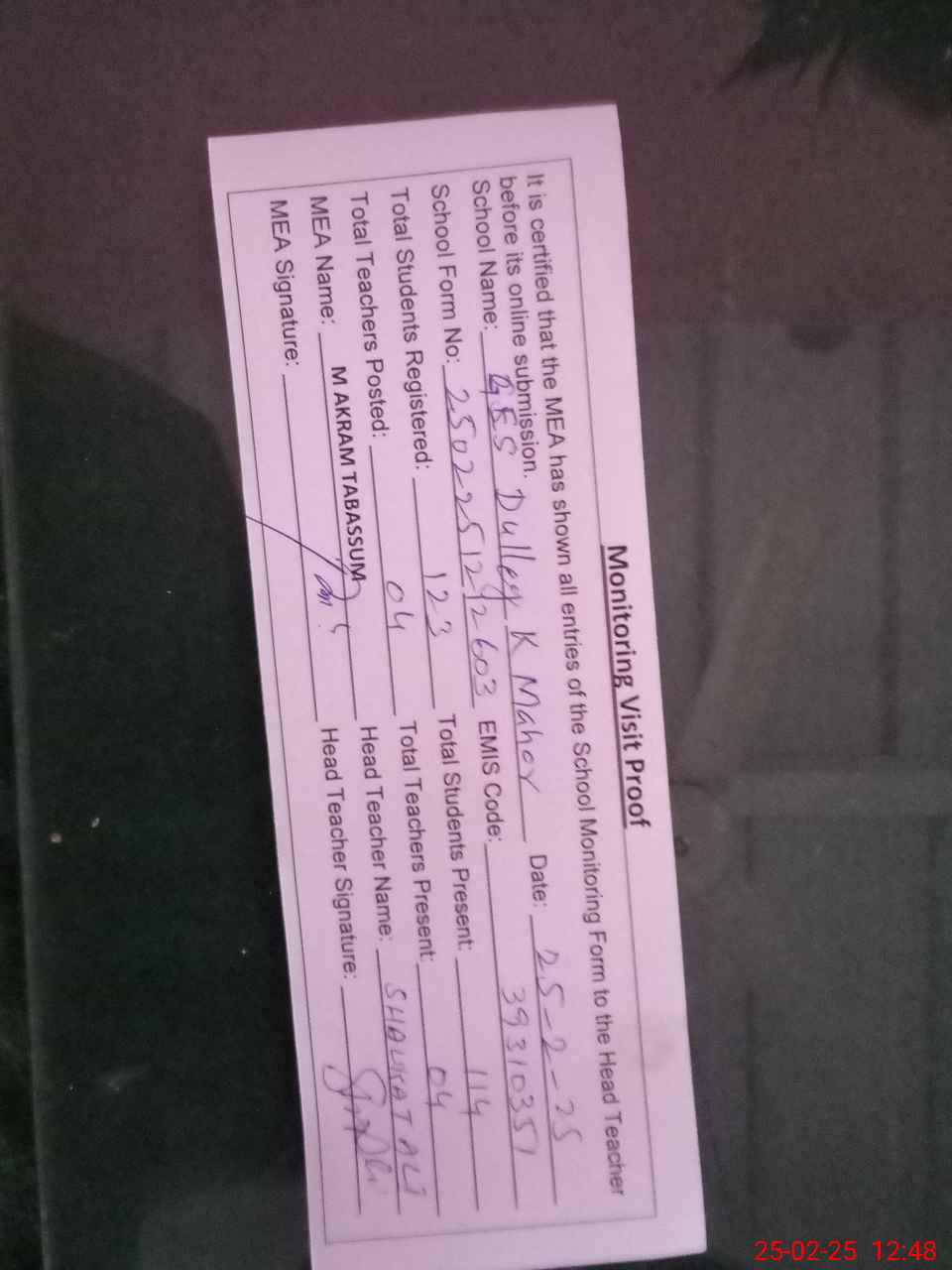 | Certified that this School was Inspected by the Undersigned MEA/DMO Today and the Information Stated Above is as Per Record. | |||||